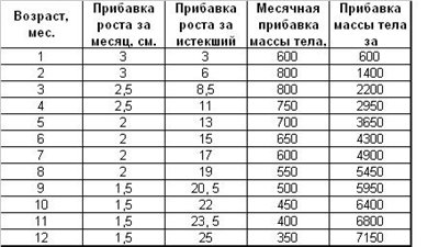 Таблица средний величин прироста массы тела и роста ребенка в первый год жизни.